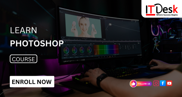Learn Photoshop at IT Desk Hyderabad. Hands-on training in editing, retouching, designing with real-time projects and placement support.